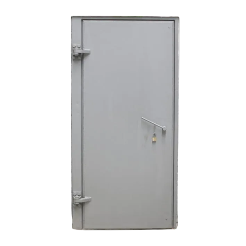 - Jednoskrzydłowa blacha stalowa o grubości 25 mm, wyposażona w wytrzymałe zawiasy i mechanizm blokujący.