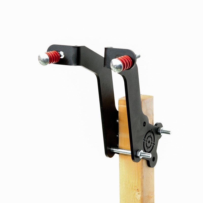 Uchwyt 2S wykonany z czarnej stali. Służy do zawieszania różnego rodzaju gongów posiadających otwory. Zawieszony cel pochyla się pod kątem 30 stopni. Rozstaw otworów montażowych gongów od 105 do 135 mm.