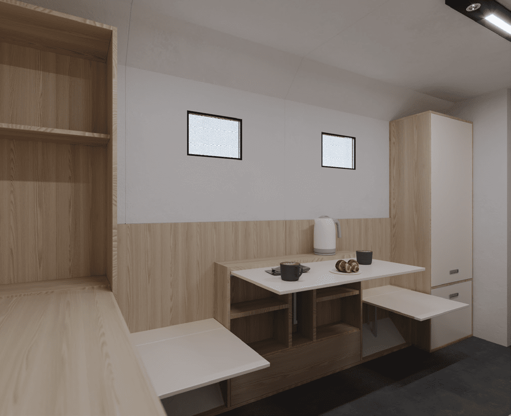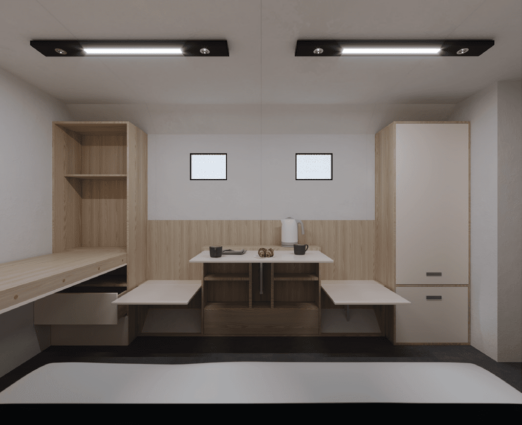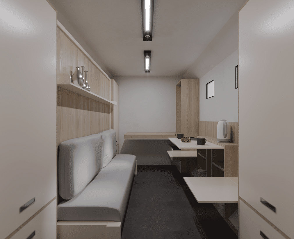 Podstawowy model schronu ma wymiary 4,5 m x 6,0 m i zapewnia miejsce dla 35–50 osób, gwarantując im komfortowe i bezpieczne warunki pobytu. Każdy schron wyposażony jest w: